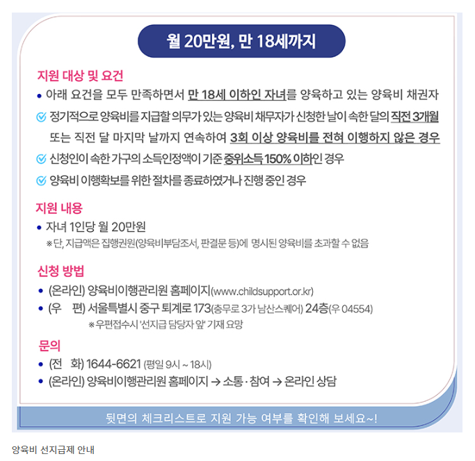 이 제도는 양육비를 받지 못한 한부모 가정의 미성년 자녀에게 국가가 선지급 형식으로 매달 양육비를 먼저 지급하고,