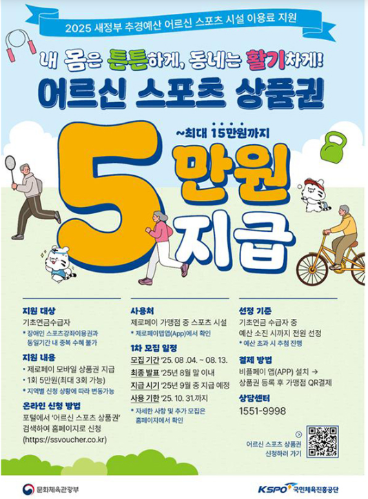 문화체육관광부와 국민체육진흥공단이 함께 시행하는 ‘어르신 스포츠 상품권’은 기초연금을 받는 만 65세 이상 어르신을 대상으로 1인당 최대 15만 원까지 스포츠활동 비용을 지원하는 사업입니다.
