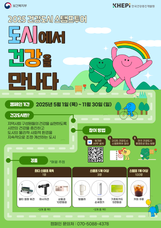 2025년, 보건복지부와 한국건강증진개발원(KHEPi)은 시민들의 건강 증진과 건강한 도시 문화 확산을 위해 “건강도시 스탬프투어”를 진행합니다.