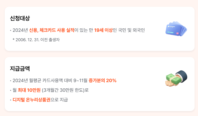 지난해 월평균 카드 소비액이 100만 원이고 올해 10월 카드 소비액이 130만 원이라면, 증가액 30만 원의 20%인 6만 원이 디지털 온누리상품권으로 지급됩니다. 지급일은 익월 15일이며, 총 한도는 월 10만 원, 3개월간 최대 30만 원입니다.