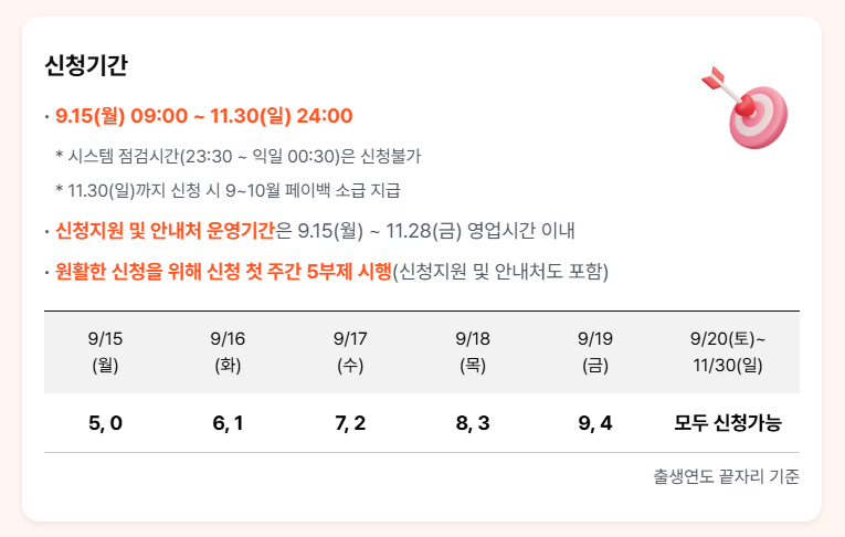 ※ 신청 첫 주는 출생연도 끝자리별 5부제가 적용되며, 9월 20일부터는 누구나 제한 없이 신청할 수 있습니다.