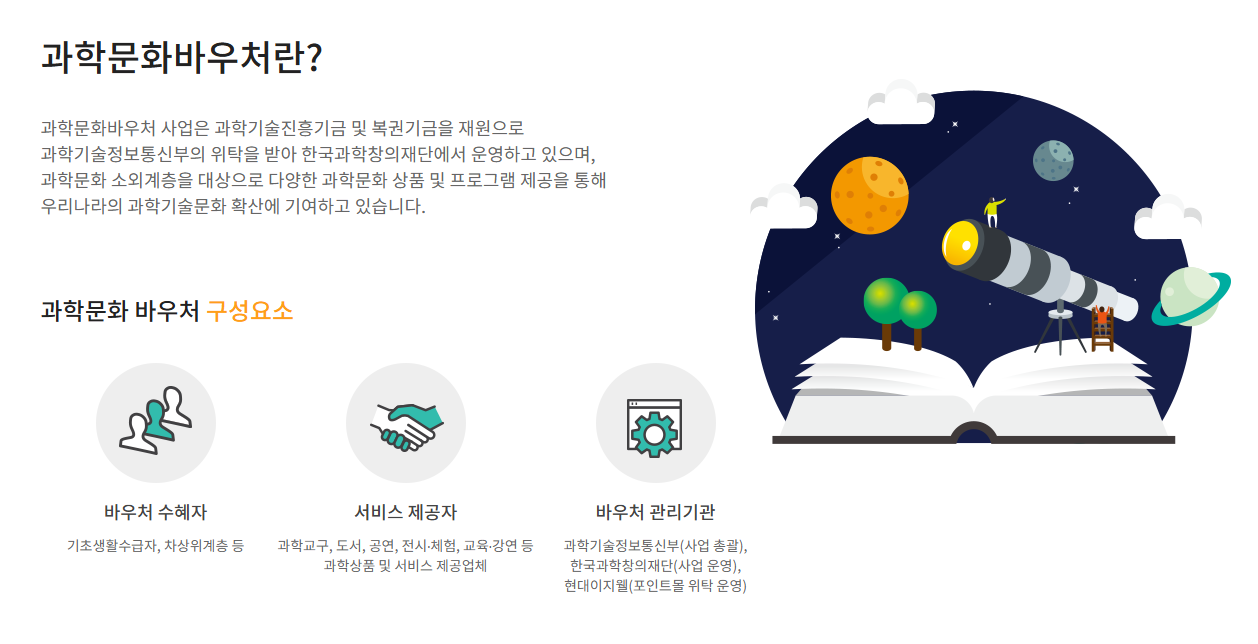 과학문화바우처는 과학기술정보통신부가 주최하고 한국과학창의재단이 주관하는 과학문화 복지 증진 사업의 일환으로, 경제적·사회적으로 문화 접근성이 낮은 소외계층을 대상으로 과학문화 활동 참여 기회를 확대하기 위해 마련된 과학 체험 전용 문화상품권입니다.