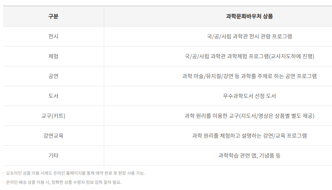 이를 통해 수혜자는 다양한 과학문화 콘텐츠를 무료 혹은 할인된 비용으로 경험할 수 있으며, 과학관, 천문대, 과학 공연, 전시, 체험 교육 등 다양한 과학문화 시설과 프로그램을 이용할 수 있습니다.