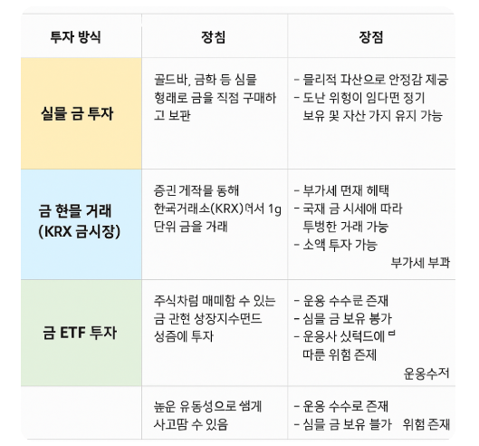 다음은 투자자가 직접 실행할 수 있는 대표적인 금 투자 방법입니다. 각 방식은 투자 목적, 자금 규모, 보유 형태 등에 따라 장단점이 존재하므로, 충분한 이해 후 선택하시기 바랍니다.