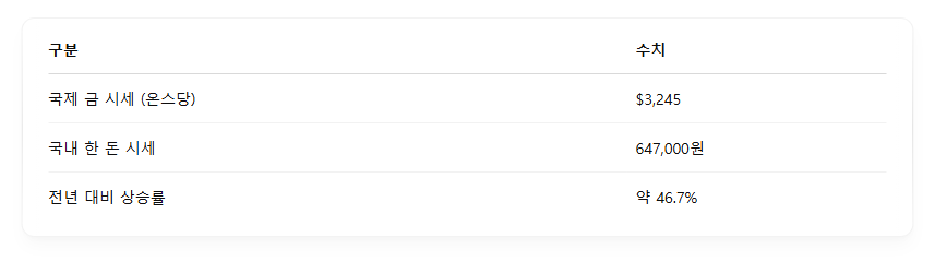 2025년 4월 기준, 국제 금 시세는 온스당 3,245달러로 역대 최고치를 기록했습니다.