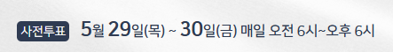 이번 제21대 대통령 선거의 사전투표는 2025년 5월 29일(목)부터 5월 30일(금)까지 이틀간 진행됩니다.