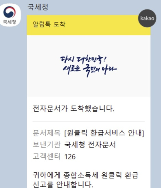 국세청은 환급 대상자에게 '국세청 인증 마크가 포함된 카카오 알림톡'을 보냅니다.