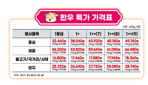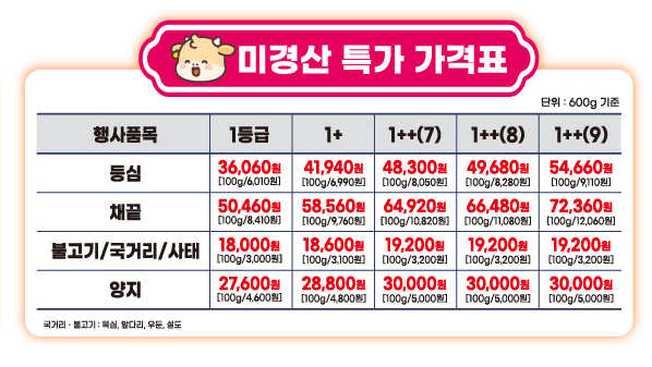 이번 행사에서는 다양한 부위의 한우를 최대 50% 할인된 가격에 구매할 수 있습니다. 예를 들어, 1등급 등심은 100g당 5,410원에 판매되며, 이는 대형마트 정상가 대비 상당한 할인율입니다.