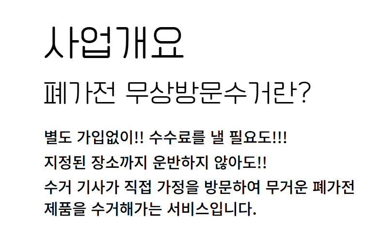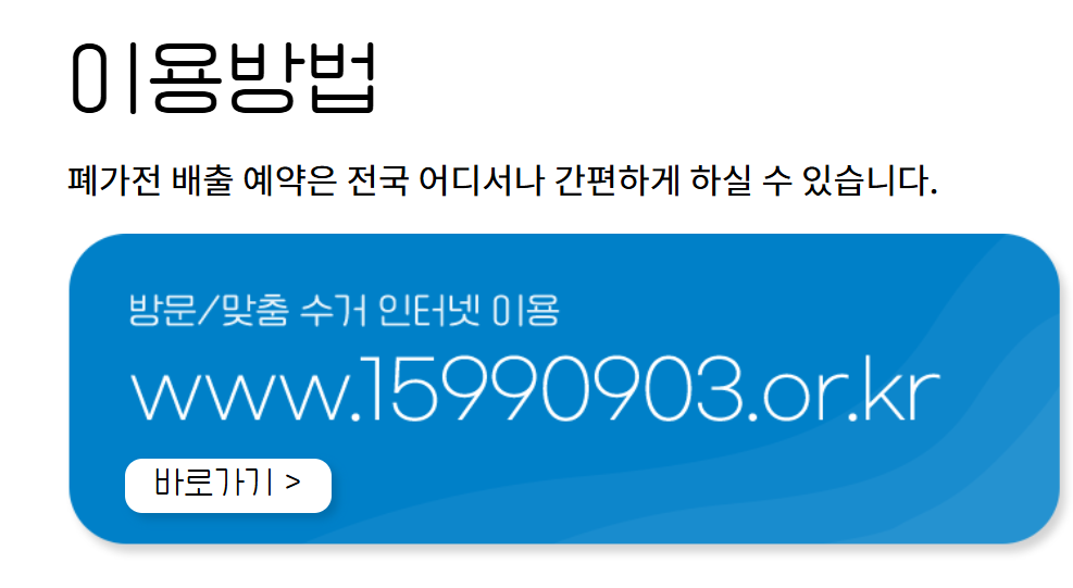 ‘폐가전 무상 수거 서비스’는 환경부가 지정한 위탁기관 e순환거버넌스가 운영하는 전국 단위의 무료 방문 수거 서비스입니다.