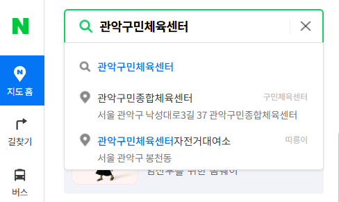 상단 검색창에 예약하고 싶은 시설명 입력 (예: "○○구민체육센터")