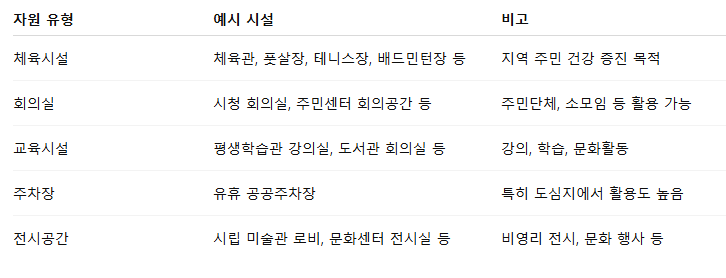 공유누리에서는 전국 약 1,200여 개의 공공시설이 예약 대상입니다. 주요 자원 종류는 아래와 같습니다.
