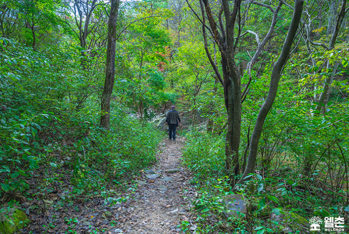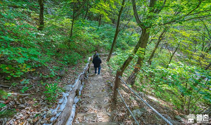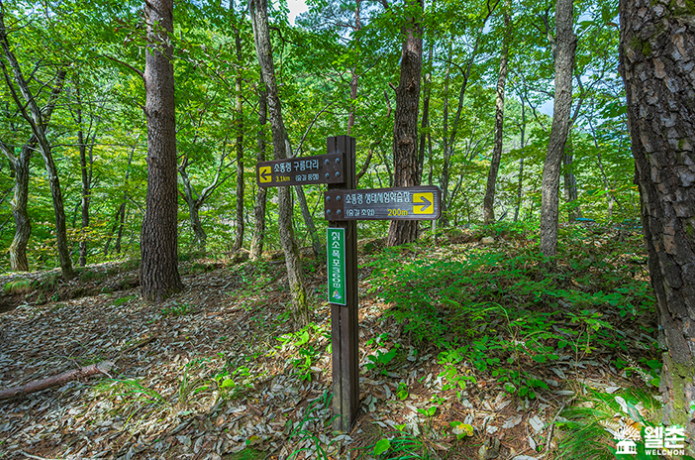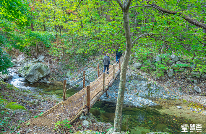 인근 칡소폭포까지 약 560m를 왕복하는 트래킹 구간이 여행객들에게 추천하는 힐링 코스라고 하는데요. 시원한 솔향기를 맡으며, 녹음 사이사이 내려앉는 햇살의 아름다움을 눈에 담고 있을 무렵이면, 계곡 위 고즈넉하게 자리한 출렁다리를 만나게 됩니다!