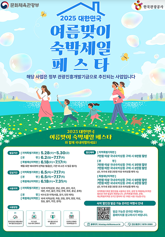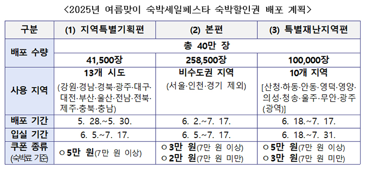 ‘2025 대한민국 여름맞이 숙박세일페스타’는 여름철 여행 수요에 맞춰 국내 숙박시설 이용 시 할인권을 제공하는 전국 단위 행사입니다. 총 40만 장의 숙박 할인권이 배포되며, 광역 지자체와 협력한 지역특별기획편, 수도권을 제외한 전 지역을 대상으로 한 본편, 산불 및 참사 피해지역을 지원하는 특별재난지역편으로 나뉘어 진행됩니다.